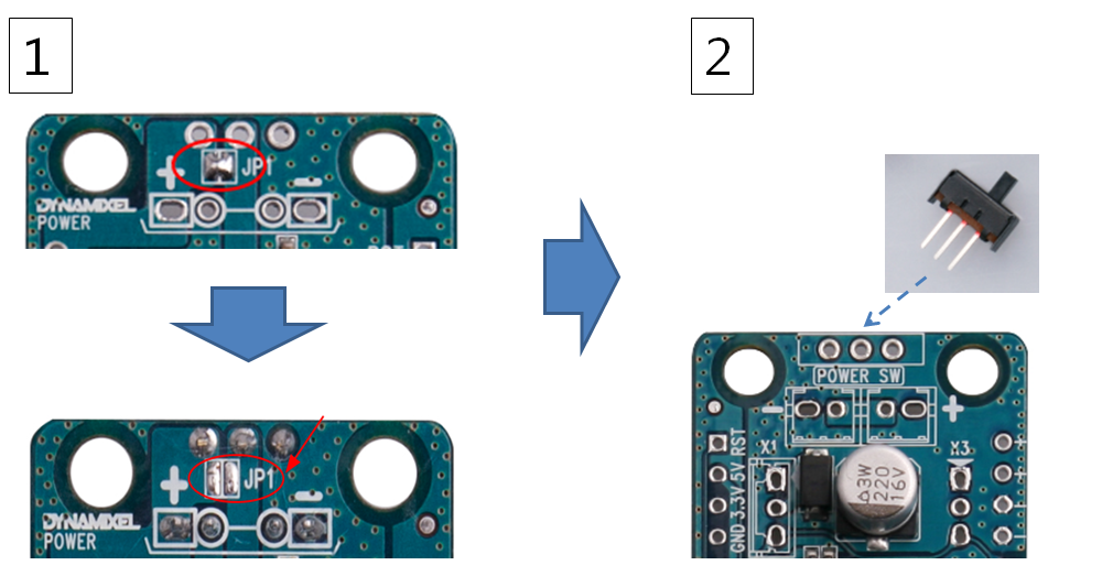 만약 이렇게 되면 OpenCM9에는 전원을 계속 공급하도록 스위치를 켜야하는데.. 그렇게 되면 뭐 충격으로 꺼질 수도 있고.. 하니깐 저 위에 사진대로 JP1를 합선시키면 될 것 같다. 합선 시키면 계속 켜져있게 된다고 하는 것 같다.